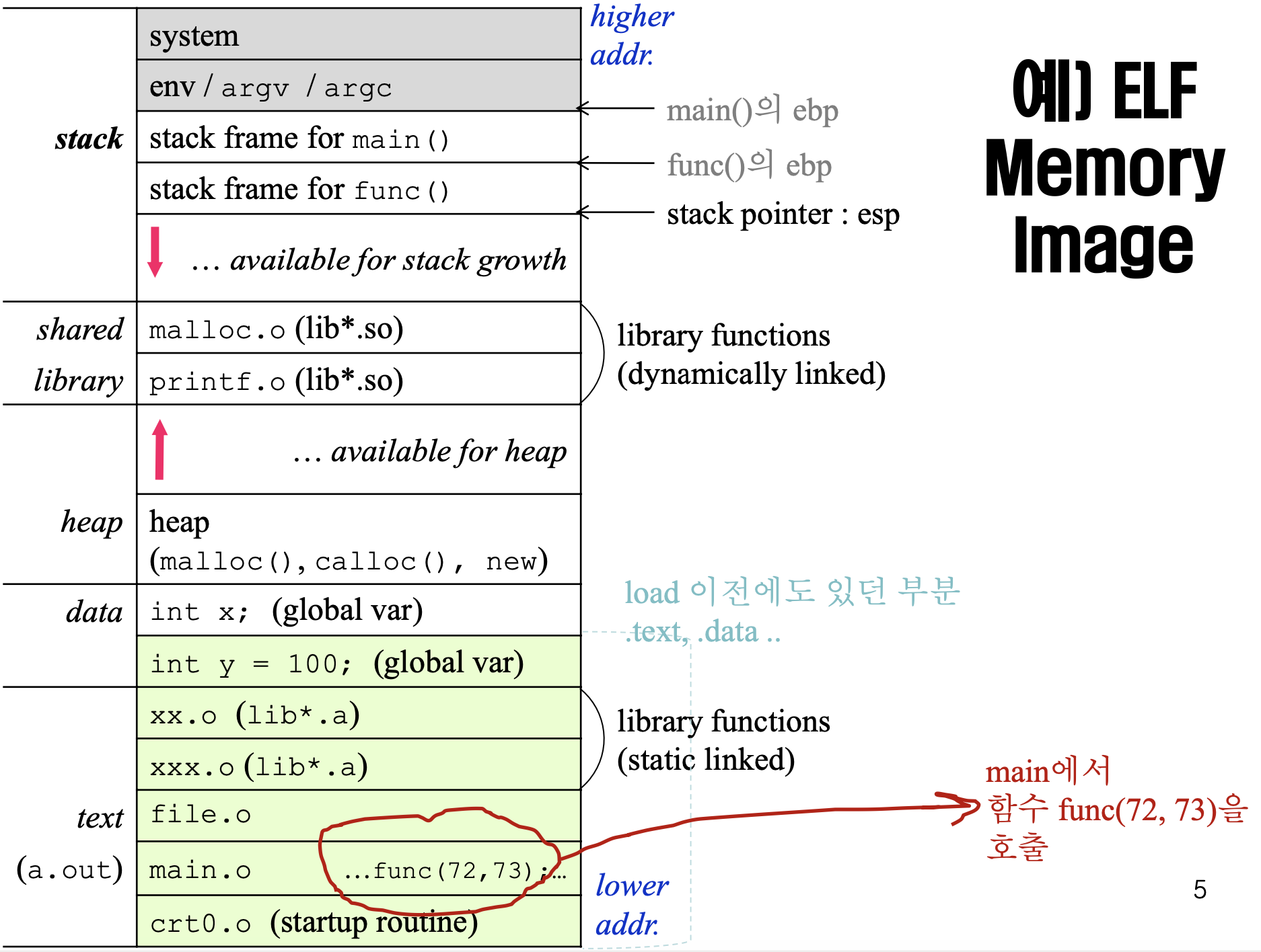위의 스택의 회색 부분에서 enviroment를 미리 넣어주며, 이 부분에서 main() 함수를 호출할 수 있다.