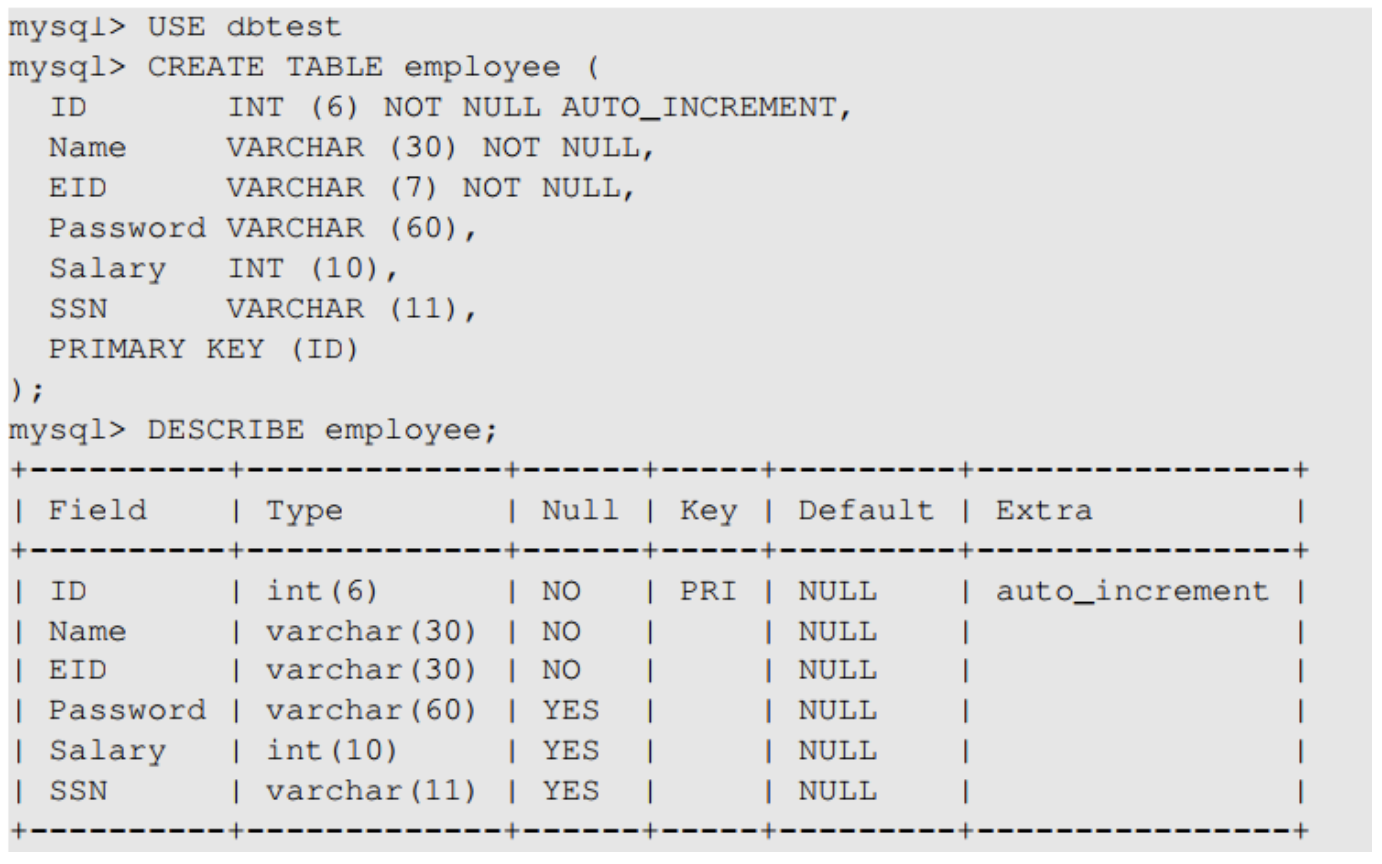 INSERT INTO 명령어를 사용하여 테이블에 새로운 레코드를 삽입할 수 있다. 위 예제에서는 employee라는 데이터베이스에 데이터를 삽입하고 있으며, ID값은 데이터베이스가 자동으로 할당해주는 것이기 떄문에 지정하지 않아도 된다.
