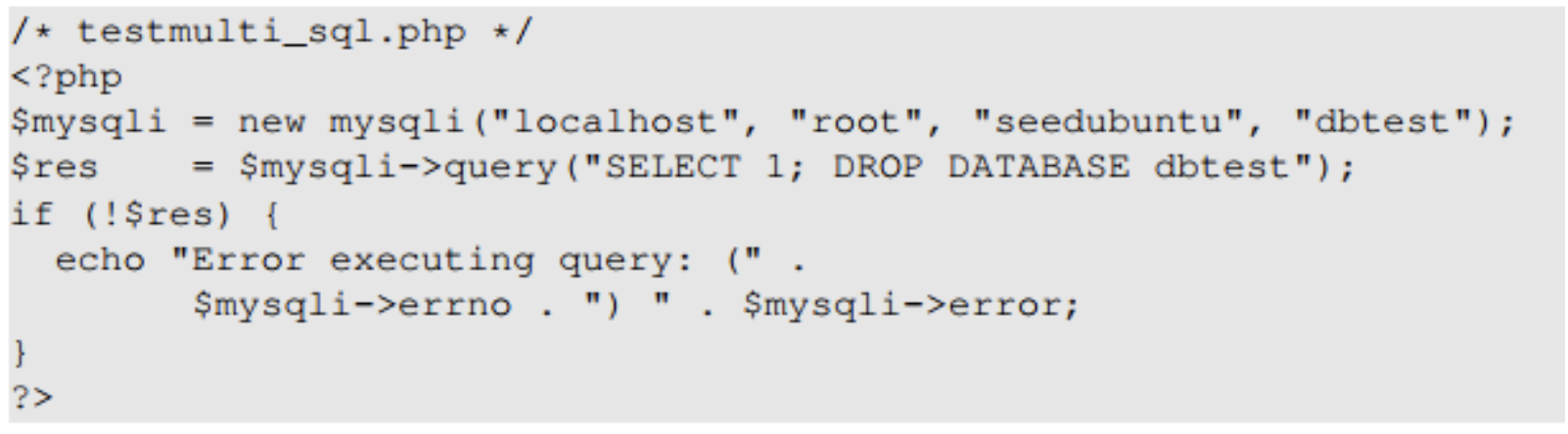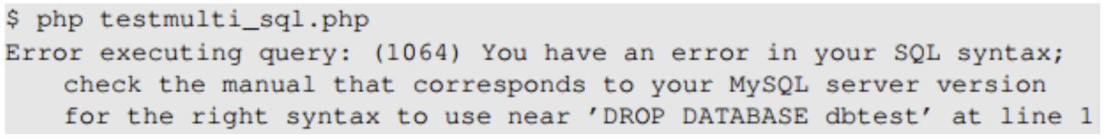 그러나 이러한 공격은 MYSQL에서 성공할 수 없다. 왜냐하면 우리가 사용하고 있는 php의 mysqli extension의 mysql::query() 메서드는 여러 줄의 쿼리를 실행할 수 없기 때문이다.