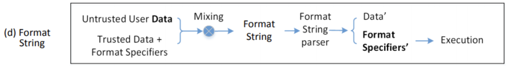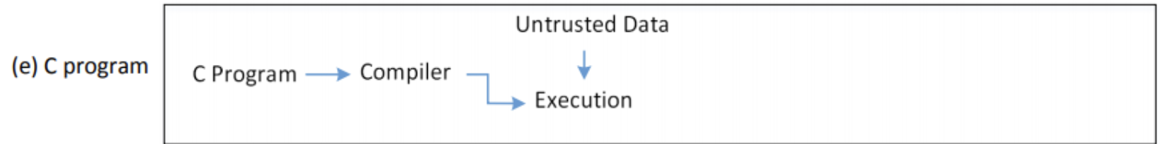 위 네 가지의 경우 모두 코드와 데이터가 섞여 있기 때문에 발생하는 문제이다. 그런데, c program은 프로그램이 모두 실행가능한 상태로 컴파일된 이후 함수의 파라미터를 유저의 입력 데이터로 처리할 수 있다. 이렇게 프로그램을 실행하는 경우 코드와 데이터가 분리되어 취약점이 발생하지 않을 수 있다.