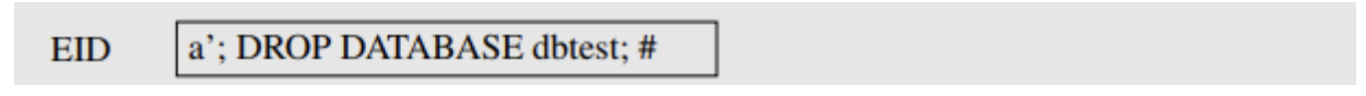 사진과 같이 a'; 입력 후 새로운 SQL문인 DROP DATABASE dbtest; #을 입력하면 데이터베이스 전체를 삭제할 수 있다. 위와 같이 명령어를 입력할 경우 서버에 실제로 반영되는 SQL문은 아래와 같다.
