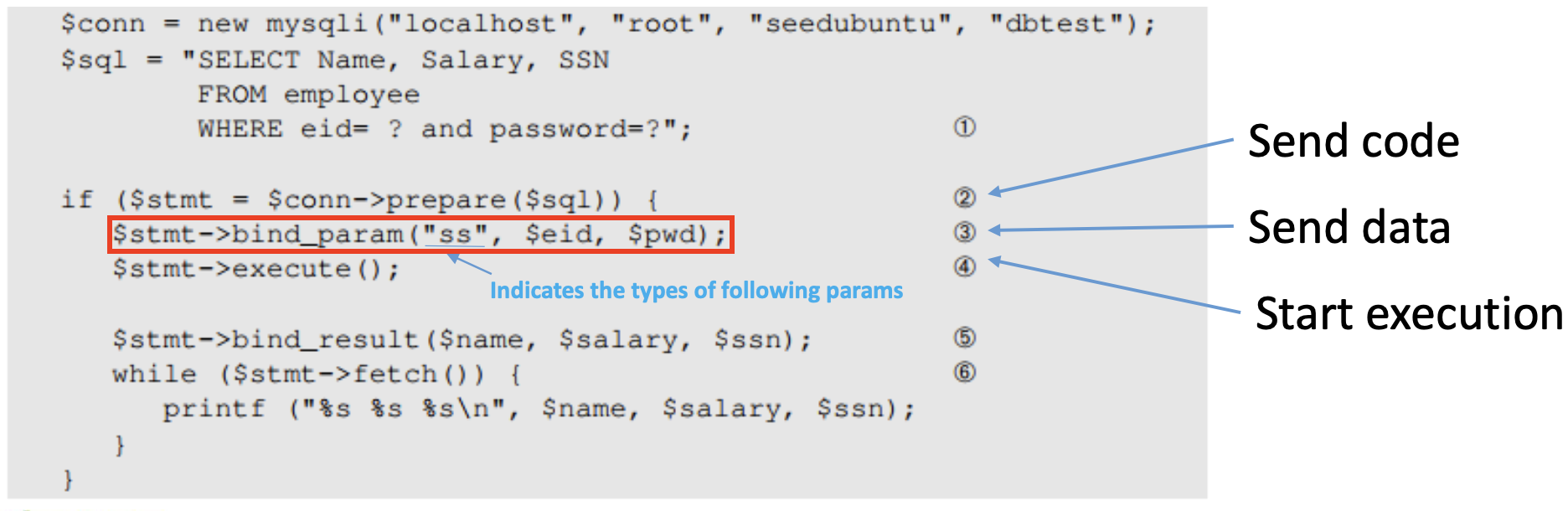 하지만 위와 같이 코드를 미리 컴파일한 후 코드를 전송하고, 이후 bind_param() 함수를 이용하여 유저의 입력을 코드의 파라미터 값으로 넣어줄 수 있다. 즉, 코드 영역을 미리 만들어두고 실행 시 필요한 파라미터를 매핑해주는 방법이다.