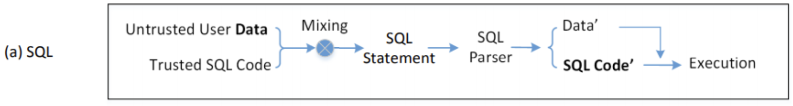 SQL문이 실행되기 위해서 신뢰성 없는 유저의 입력과 신뢰성 있는 코드를 섞어 SQL Statement를 생성한 후 SQL parser를 통해 데이터와 SQL 코드를 분리한 후 실행한다.