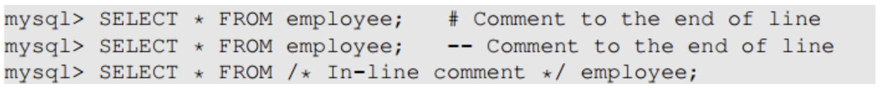 SQL문에도 주석이 존재한다. "#"과 "--"을 사용하면 one line만 주석처리되며, 해당 기호 뒷부분부터 주석처리된다. "/*", "*/" 기호를 이용하면 c언어처럼 여러 줄을 주석처리 할 수 있다.