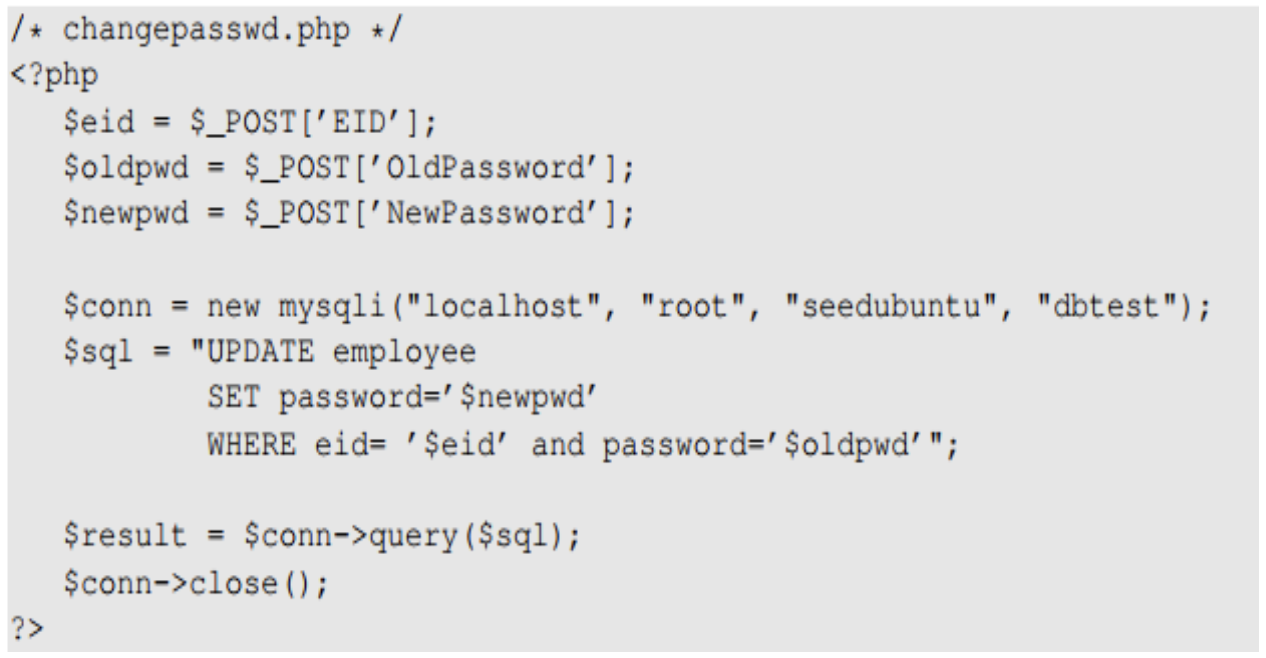 submit 버튼을 클릭하면 HTTP POST 요청이 전송되고, 해당 요청은 사용자의 비밀번호를 변경하기 위해 UPDATE문을 사용하는 서버 스크립트인 changepasswd.php로 전송된다.