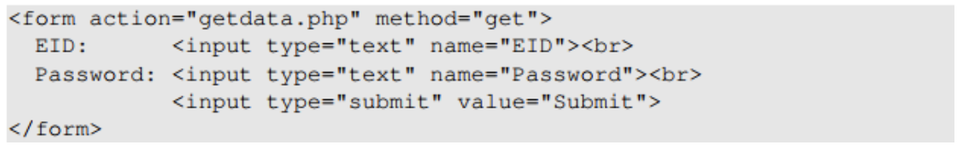 위 입력창을 구현한 HTML 코드이다. 입력으로 받은 데이터를 서버의 php 코드인 getdata.php를 통해 GET 메소드로 전송하고 있음을 알 수 있다.