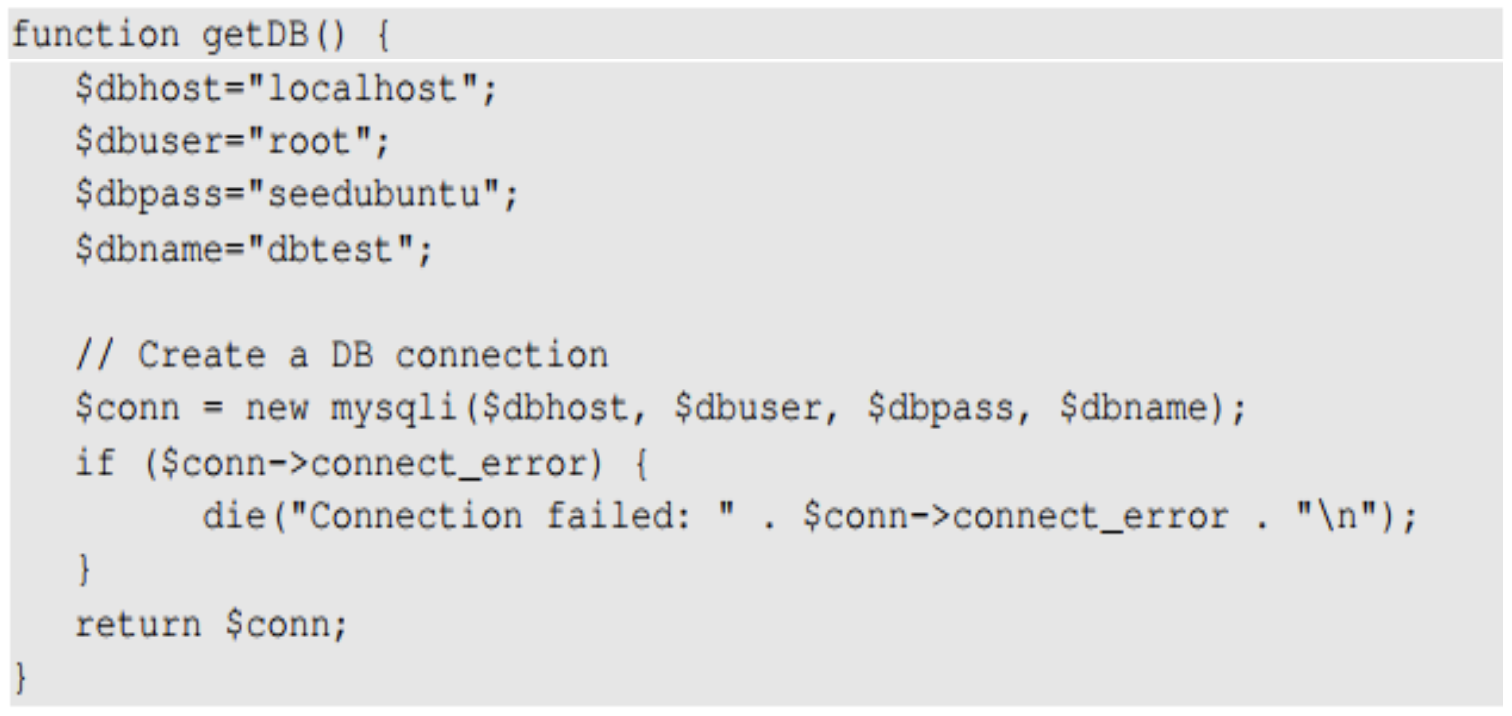 데이터베이스와의 연결을 위해 new mysqli() api를 사용하여 연결을 생성할 수 있다. 이때, 인자로는 서버의 위치, 데이터베이스의 아이디와 비밀번호, 데이터베이스의 이름까지 총 4개의 인자를 필요로 한다.