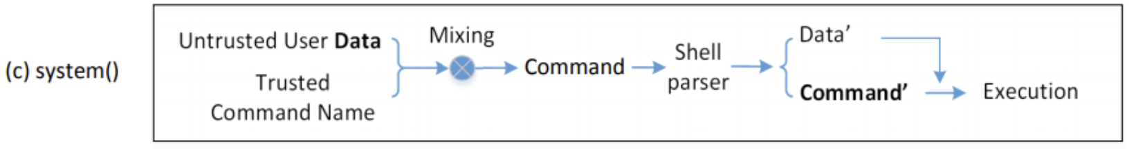 프로그램에서 시스템 함수를 이용할 때, 활용하는 데이터가 유저의 입력인 경우 앞선 두 방법과 동일한 방법으로 공격이 가능하다. 마찬기자로 데이터와 코드가 섞여서 발생하는 문제다.