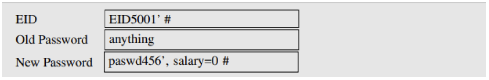 이러한 방식을 이용하여 다른 사람의 EID 값을 통해 다른 사용자의 값도 변경할 수 있다. 이때 EID fleid에 #을 넣어 주석처리하면 비밀번호를 몰라도 공격이 가능하다.