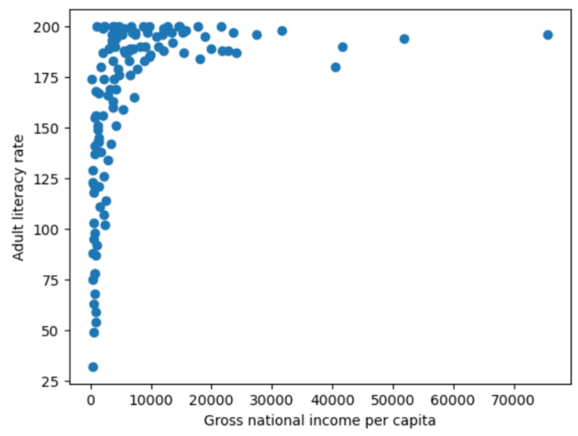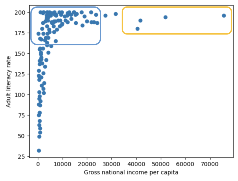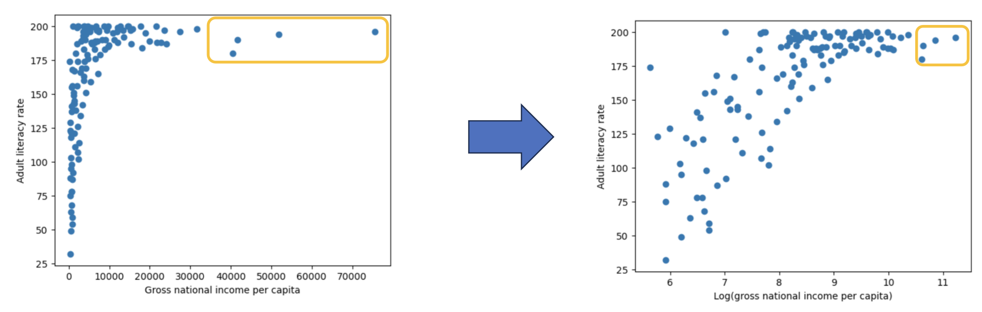 우리는 Linearization을 위해 스케일을 잘 선택해야 한다고 앞에서 언급한 적이 있었다. 이는 Linearization을 한다는 것에 조금 더 의미가 있다. 즉, 우리는 위 그래프와 같이 각 데이터 포인트들이 몰려 있는 형태가 아닌, 어떤 환경일 때 Linear한 relationship가 나오는지 확인하는 것이 중요하다.