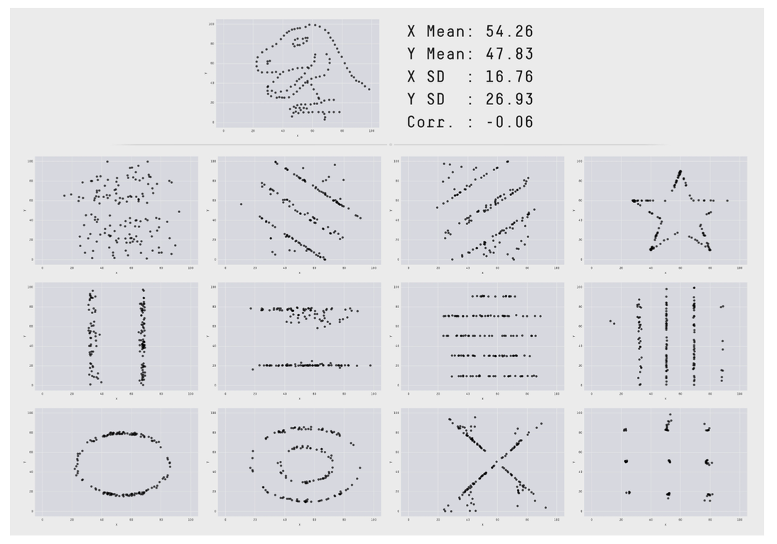 위 사진은 평균, 표준편차, 상관계수가 모두 동일한 데이터에 대해 서로 다르게 표현한 모습이다. 우리가 어떤 대표값으로 해당 데이터의 성격을 파악하는 것이 중요하긴 하지만 실제로 visualization하여 그 안의 property를 직접 눈으로 확인하는 과정도 매우 중요하다.