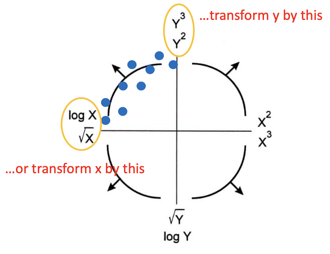 예를 들어 데이터가 위 사진과 같이 분포되어 있는 경우 x의 경우에는 log나 루트를 씌워주고, y의 경우 세 제곱, 또는 네 제곱을 진행하는 식으로 trandsformation을 진행하면 결과적으로 데이터가 선형 관계를 가지게 된다.