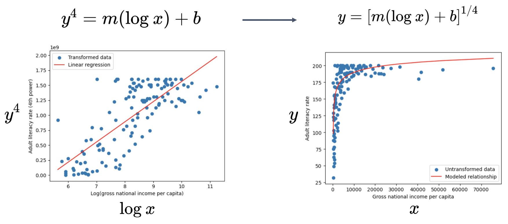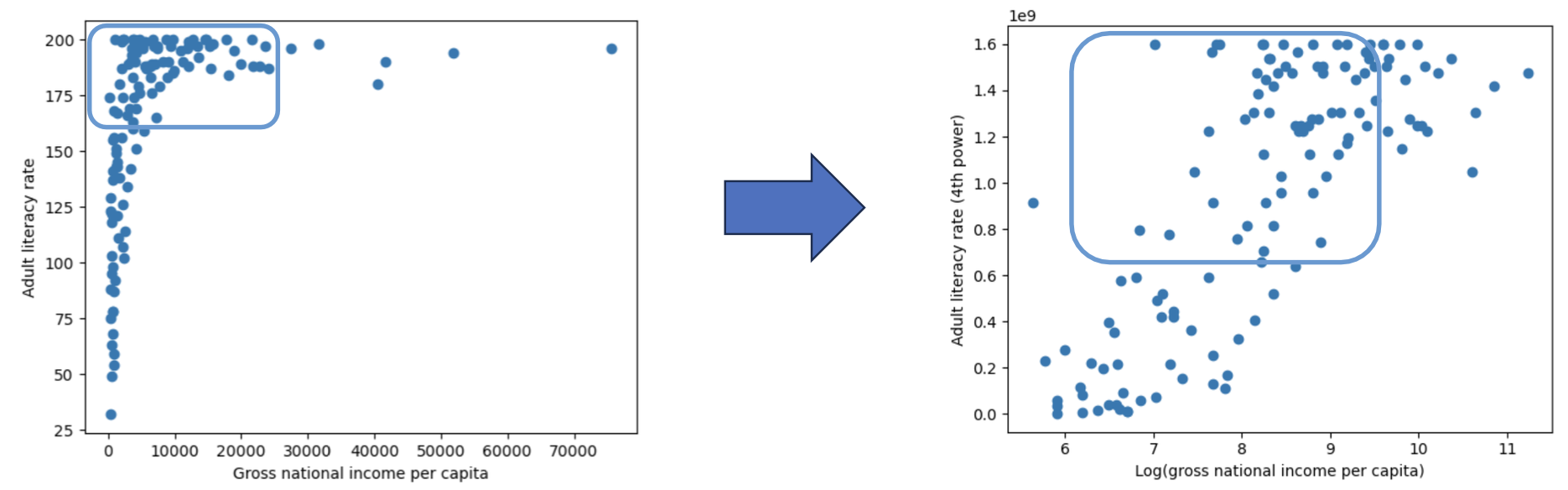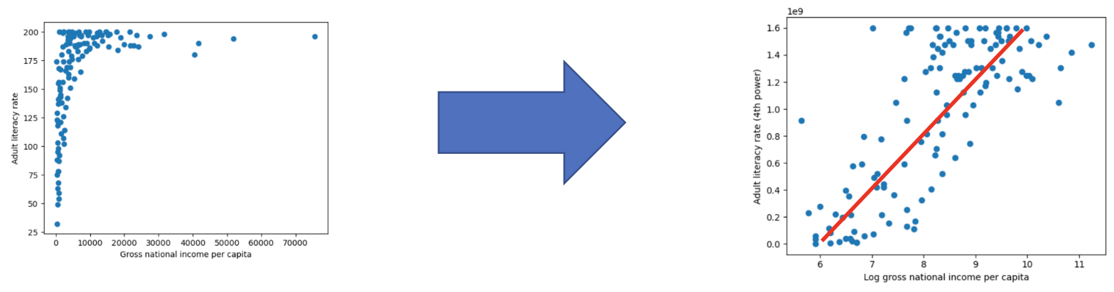 오른쪽의 경우 데이터의 스케일링을, y는 4제곱을 진행하여 transfomation된 모습이다. 따라서 linear한 그래프를 그려낼 수 있다. 데이터를 Linearization하는 것은 우리가 해석하기 쉽기 때문이다.