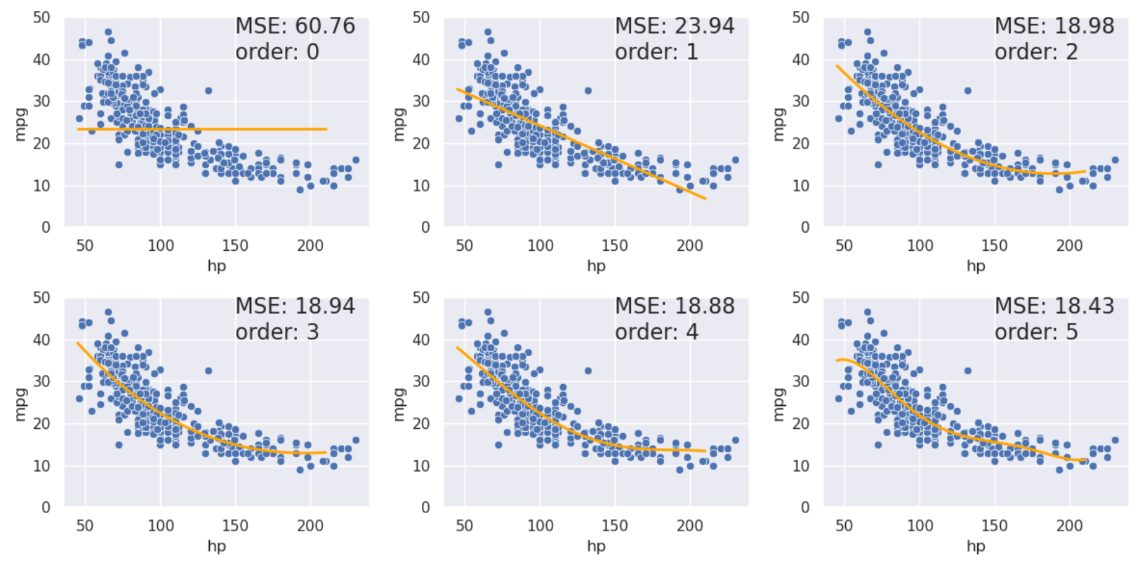 즉, degree가 높아질 수록 위 사진과 같이 regression 선의 변화가 심해지는 것을 확인할 수 있는데, degree가 높아질 수록 MSE도 낮아지고 있음을 확인할 수 있다.