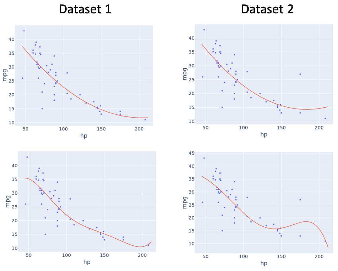 위 사진은 자동차의 연비와 관련한 데이터 셋에서 무작위로 6개의 데이터를 뽑아 해당 데이터에 대해 완벽하게 맞는 모델을 위와 같이 제작했다고 하자.