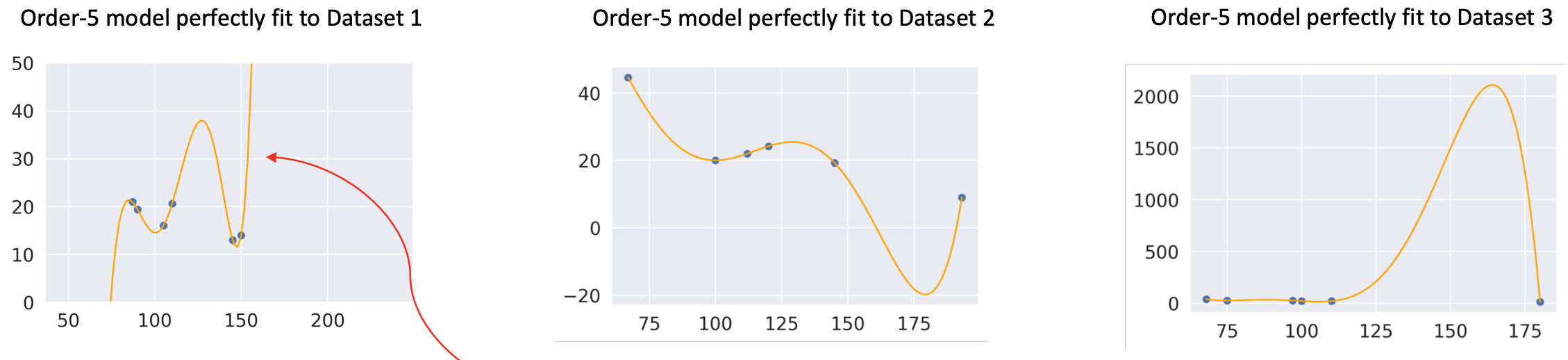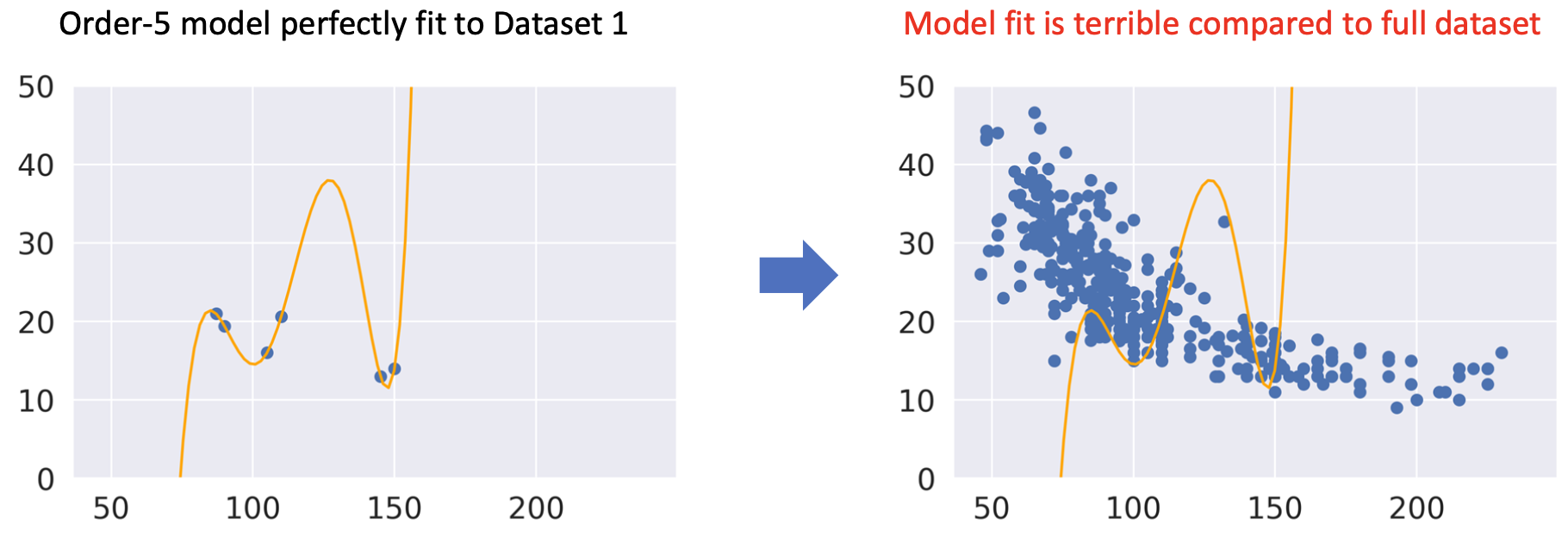 위 사진은 자동차의 연비와 관련한 데이터 셋에서 무작위로 6개의 데이터를 뽑아 해당 데이터에 대해 완벽하게 맞는 모델을 위와 같이 제작했다고 하자.