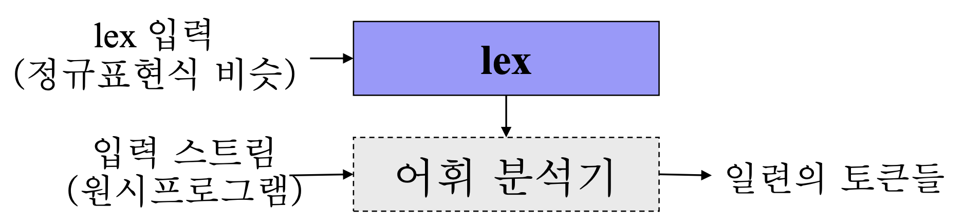 이번에는 가장 전통적으로 유명한 도구를 이용하여 어휘 분석기를 직접 만들어 보자. 오래 되었지만, 다른 도구들도 이 도구를 기반하여 만들어졌다. 어휘 분석기 도구 Lex 전통적인 방법으로 C 언어가 기반이다. 구문 분석기인 yacc과 밀접한 관련이 있으며 발전된 버전인 flex를 더 많이 사용한다. ANTLR java 기반으로, 구문 분석 시 다시 언급하겠다. 기타 도구로는 JavaCC, SableCC가 있다. Lex(렉스) 렉스는 1975년 레스크에 의해 발표된 어휘분석기 생성기이다. 이때 주의할 점은 어휘 분석기가 아니라 어휘 분석기 "생성기"라는 것이다. 사용자가 정의한 프로그램의 정규표현과 실행코드를 입력받아 C언어로 쓰여진 프로그램(어휘분석기)을 출력한다. 어휘 분석기의 생성 및 동작 어휘 분석..